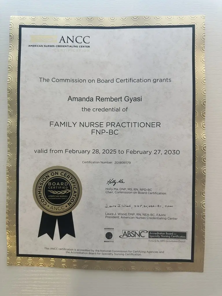 Dr. Amanda Gyasi is a Doctor of Nursing Practice and a nationally certified Family Nurse Practitioner, credentialed by the American Nurses Credentialing Center (ANCC). She has a strong foundation in clinical leadership, primary care, and integrative wellness. She earned her Bachelor of Science in Nursing from Valdosta State University in 2015 and completed her Doctor of Nursing Practice at the University of Arizona in 2019, where her doctoral project focused on Improving Dietary Habits in African American Patients with Essential Hypertension.