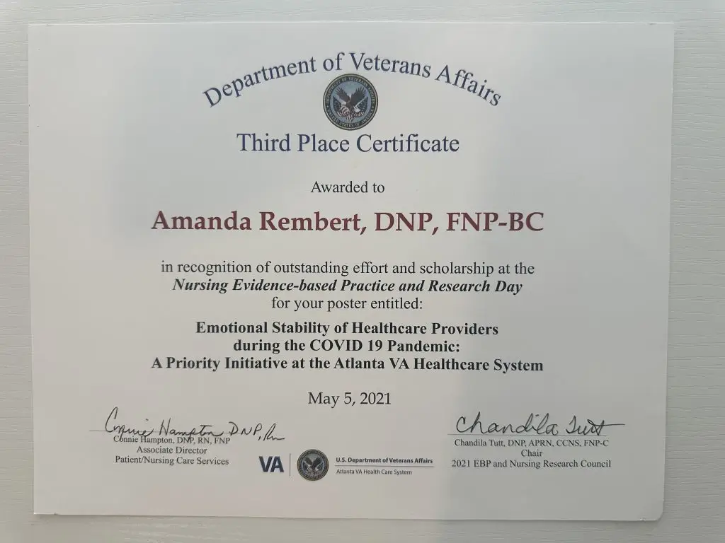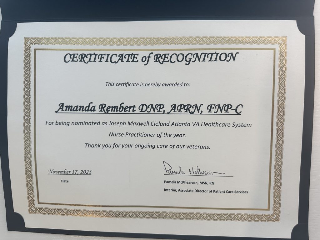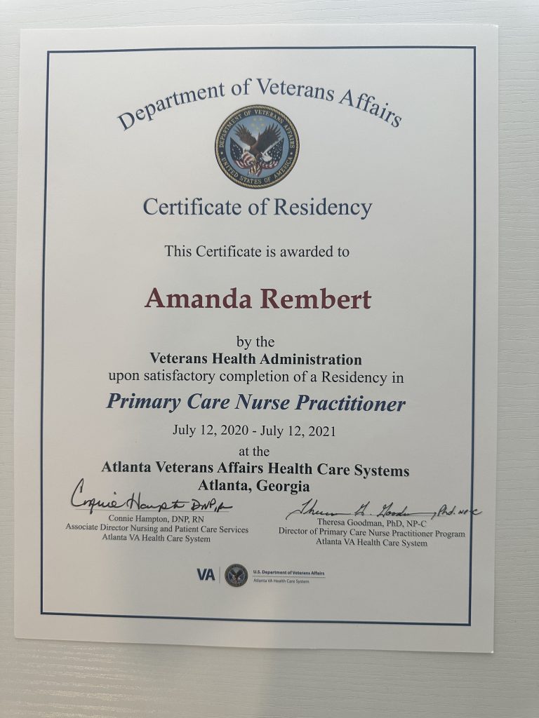 To further enhance her expertise as an advanced practice provider, she completed the Primary Care Nurse Practitioner Residency Program at the Atlanta Veterans Affairs, a highly-regarded program known for its comprehensive training in Veteran-centered care, chronic disease management, and evidence-based practice.